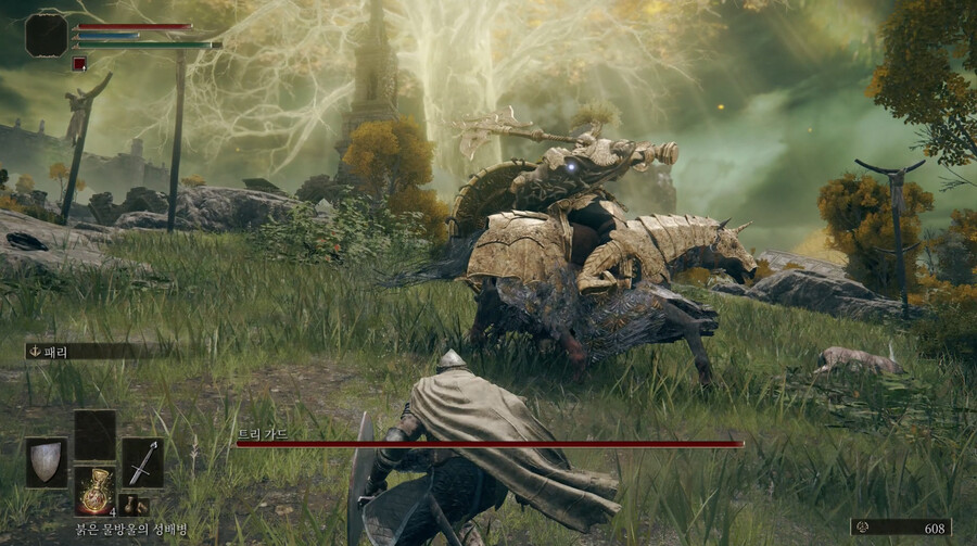 야생의 숨결보다 더 좋은 성능의 말을 갖고 있지만, 이말이 무적이라 느끼는 순간 더큰 어려움이 느낄 수 있게 설계된거 같다. 엘든링 초반에 제거할수 없는 무시무시한 괴물을 배치하고, 그와 지속적으로 싸우게 만든다. 프롬의 변태적이고 재미있는 특징 중 하나이다. 철저히 죽다보면 다른길을 가던지, 포기하게 되던지.... 어찌보면 굉장히 철학적인 배치라고 생각한다. 게임 시작부터 유저에게 의지와 시련을 주다니.. 허허허. |