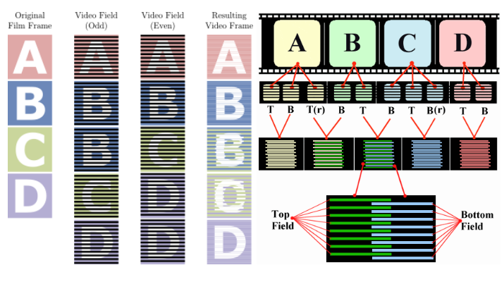 23.976 fps를 29.97 fps로 맞추기 위해 텔 레씬이라는 기법을 사용하는데 3:2 풀다운이라고도 한다. 1초에 24프레임짜리를 1초에 30프레임으로 재생하려면 4개의 프레임을 5개로 만들어야 합한다.