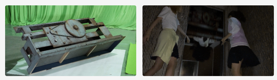 전신 크로마 복장을 착용한 사람이 실제로 인물을 잡아 당겼고, 배경 소스를 촬영해서 합성해서 완성했다.