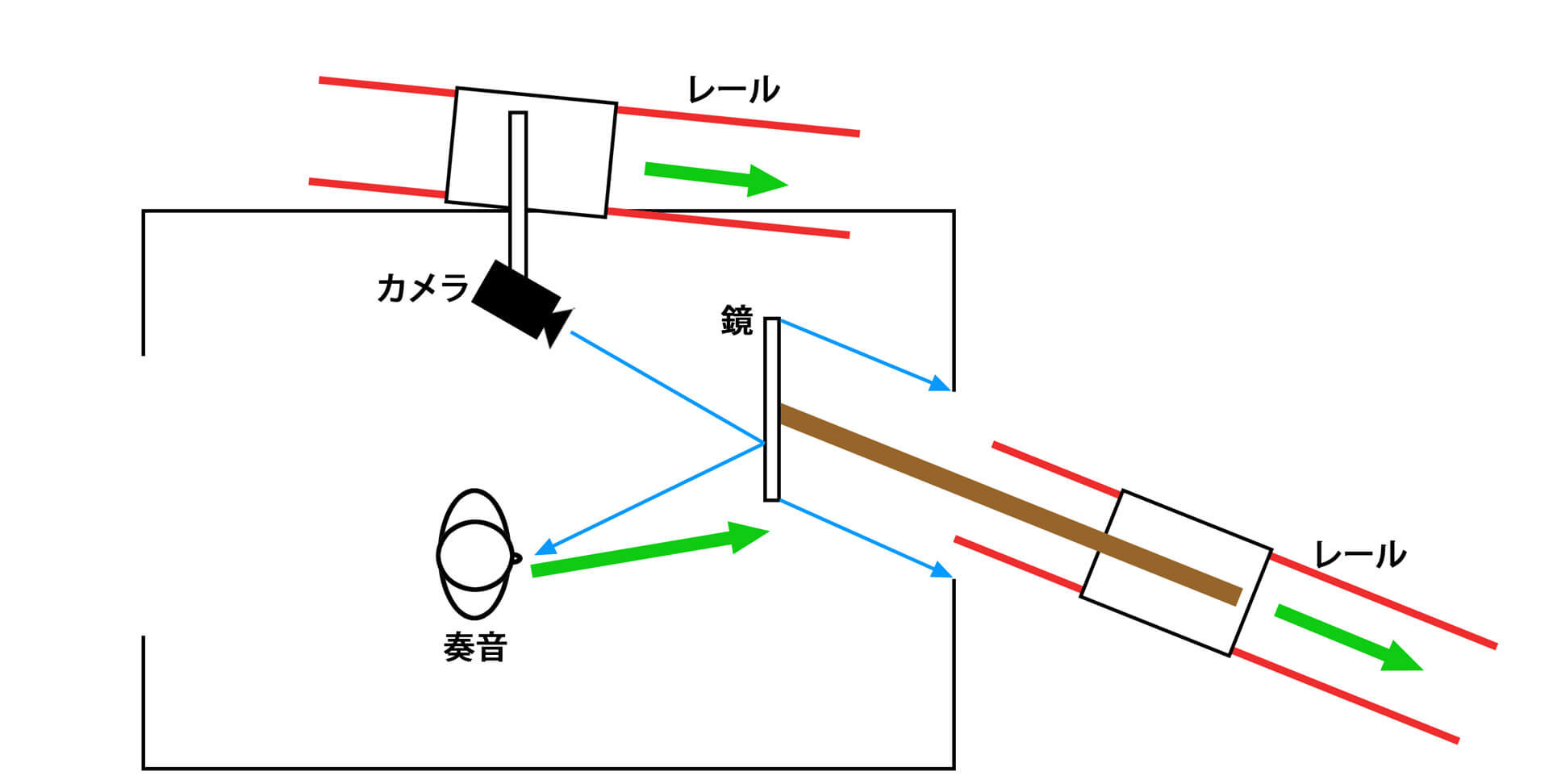 실제로는 카메라는 전 방향으로 움직이고 있어 프레임 가득 배치한 거울을 카메라와 동시에 움직이는 것으로 팔로우 촬영하고 있는 것처럼 보이고 있다.