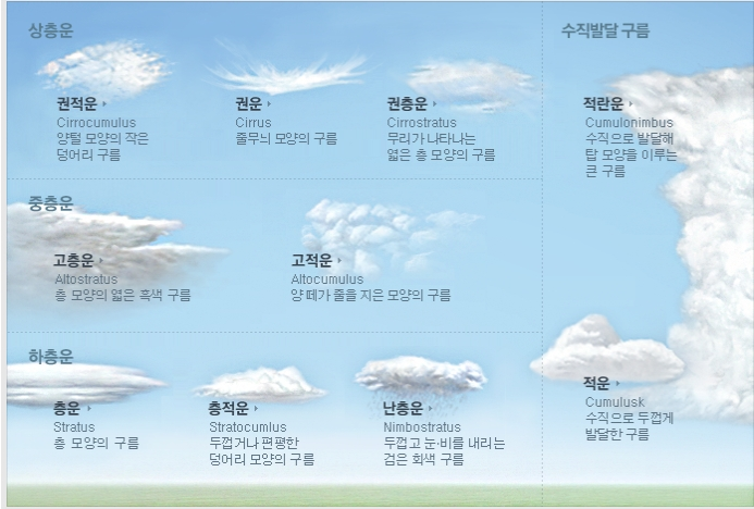 구름의 형태는 크게 나누어 10종류로 분류되며, 각각 발생하는 고도에 따라 상층운, 중층운, 하층운의 3개의 그룹으로 나뉜다. 그러면 하나씩 소개하겠습니다!