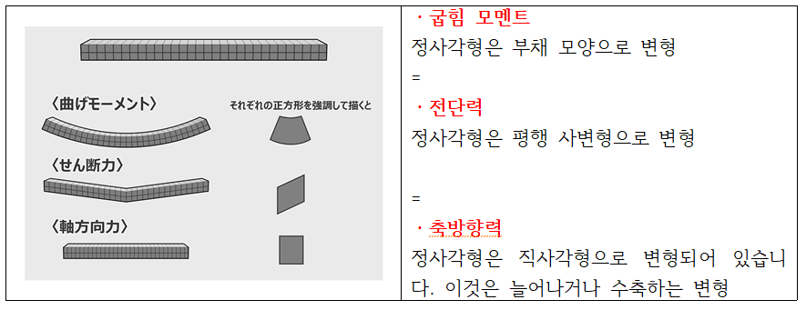 예를 들어 직육면체의 부재에 1cm 피치에 그리드를 그려, 거기에 큰 힘을 가했을 때 그리드의 정사각형이 어떻게 변형되는지를 상상하면 알기 쉽습니다. 부재 자체가 변형하려고 하는 힘은 3종류로 나눌 수 있습니다.