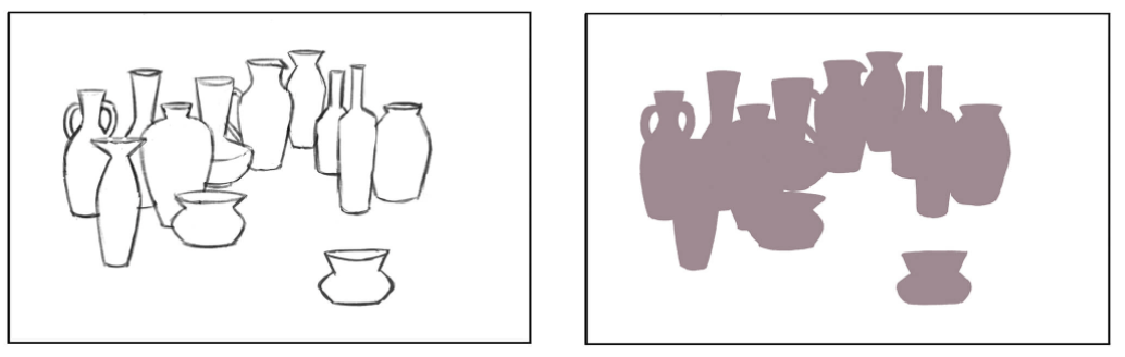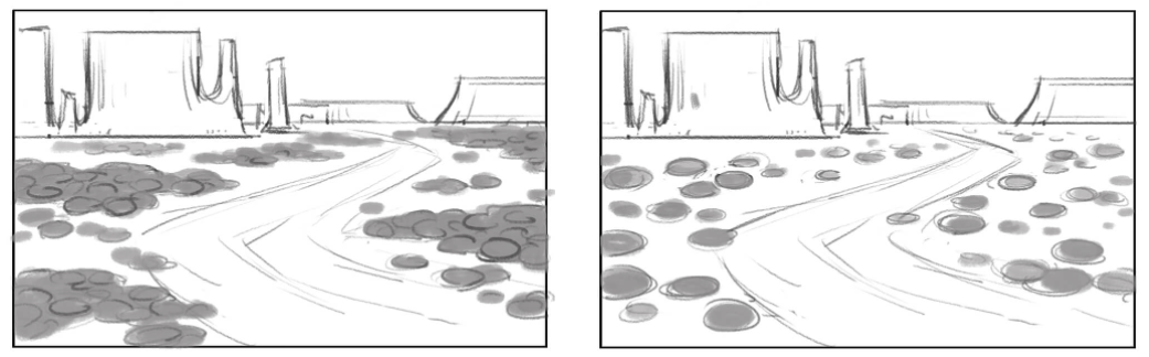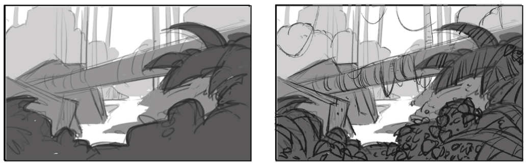 ▲ 실내에 쌓인 상자를 디자인해 봅시다. 앞의 레이어(포그라운드 레이어/Foreground Layer)와 중간 레이어(미드그라운드 레이어/Midground Layer)를 별개의 그룹으로 인식하고 어떤 형태로 하고 싶은지를 생각해 봅시다. 【왼쪽】처음에 그룹 전체의 형태를 결정, 【오른쪽】그 후로 디테일을 디자인하는 것이, 간단하고, 깨끗하게 화면을 정리할 수 있습니다