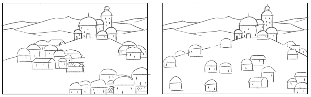 ▲【왼쪽】처음에 그룹 전체의 모양을 디자인한 후, 그 형태에 맞추어 집을 그리면 좋을 것입니다.
