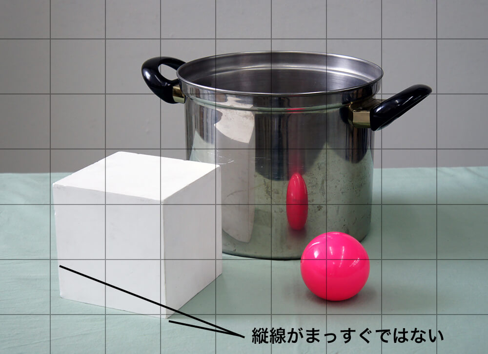 오른쪽의 그림을 그린 곳에서 카메라로 찍은 사진입니다만, 잘 보면 입방체의 세로선이 조금 기울어지고 있네요.