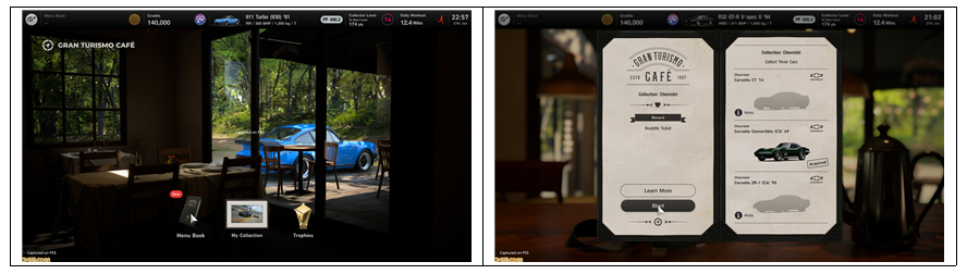 그 목표를 순서대로 클리어 해 나가는 것으로, 「GT7」의 세계에서 무엇을 할 수 있는지를 이해할 수 있게 되어 있습니다. 또한 플레이어가 수집한 자동차에 대한 해설을 Cafe의 마스터로부터 들을 수 있습니다.