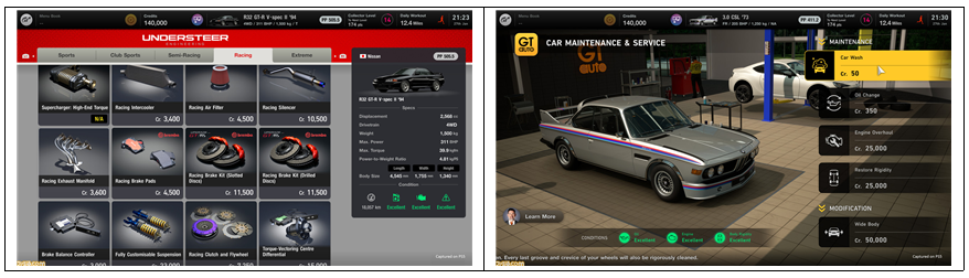 자동차에 따라서는 에어로 파츠의 변경이나 와이드 바디화 등의 커스텀도 가능. 이로 인해 자동차의 성능이 매우 달라진다. 덧붙여 과거의 작품에 있던 오일 교환이나 세차도 숍에서 실시할 수 있다고 합니다.