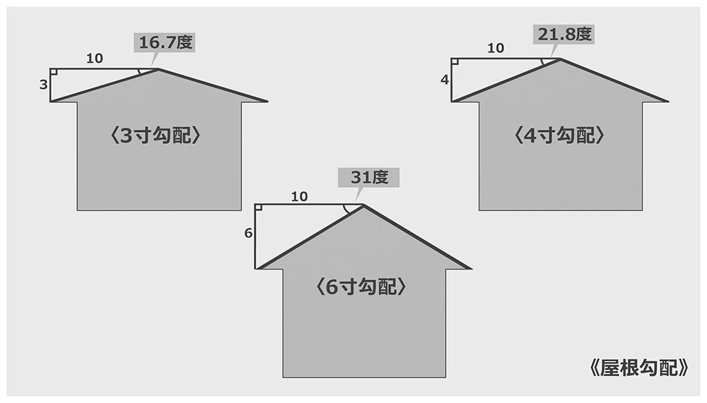 일본에서는 지붕의 그라디언트에 대해 「3치수 그라디언트」나 「4치수 그라디언트」등이라는 말을 합니다. 이것은 「가로 10치수에 대해서 세로 3치수의 경사」, 「가로 10치수에 대해서 세로 4치수의 구배」라고 하는 의미입니다. 각도로 말하면 「3치수 기울기」가 약 16.7도, 「4치수 기울기」가 약 21.8도가 됩니다. 일반적인 지붕은 3~5치수 경사입니다.