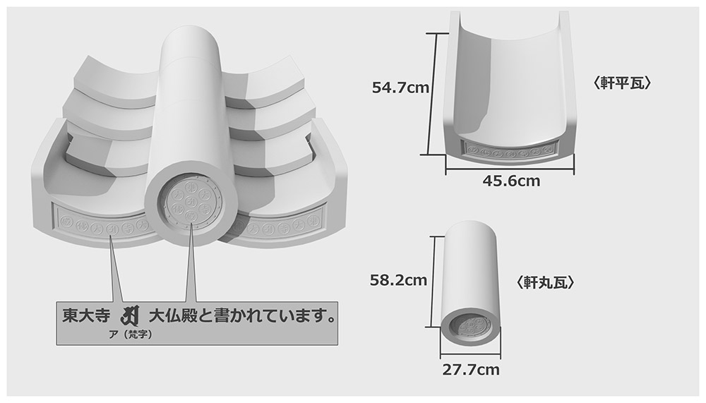 일반적인 평와의 폭은 26cm 정도입니다만, 대불전의 평와의 폭은 45cm도 있습니다. 큰 지붕에는 큰 기와를 하는 것일까요? 매수로서는, 다양한 형상의 기와를 합쳐 13만장도 사용되고 있습니다.