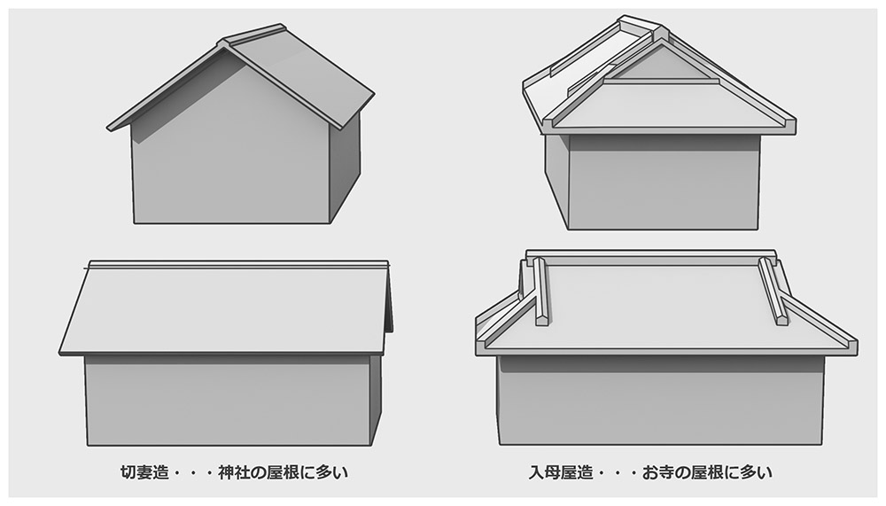사원의 지붕은, 상부는 박공조에서 그 아래에 전후 좌우에 경사를 가지는 지붕이 붙어 있는 형상의 것이 많습니다. 이것을 「입모야조」 (위 그림 오른쪽)라고 합니다.