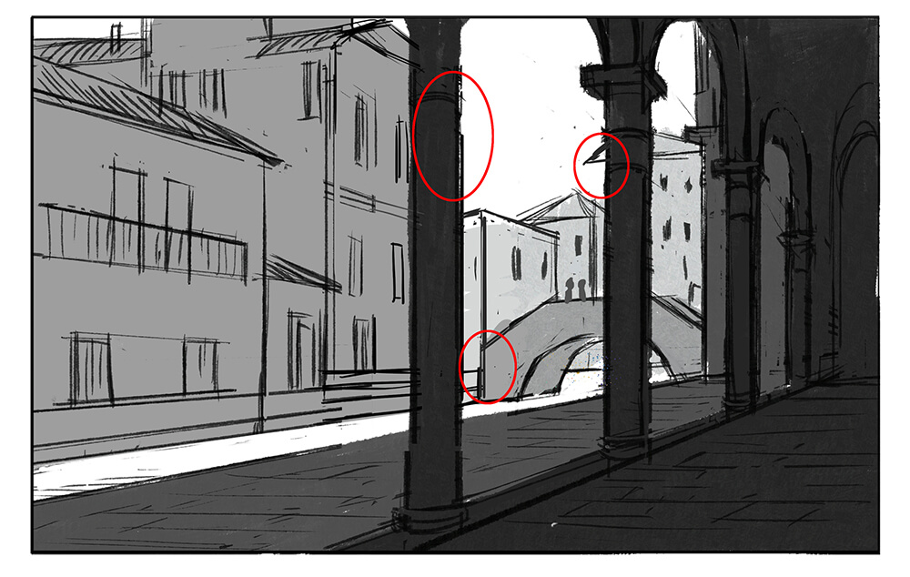 탄젠트란 레이어를 겹칠 때 발생하는 명확함이 부족한 겹침(Overlapping)입니다. 위 그림에서는, 앞의 기둥과 중간의 건물, 중간의 다리와 안쪽의 건물 등의 선이 겹쳐 있어, 깊이를 알기 어려워지고 있습니다