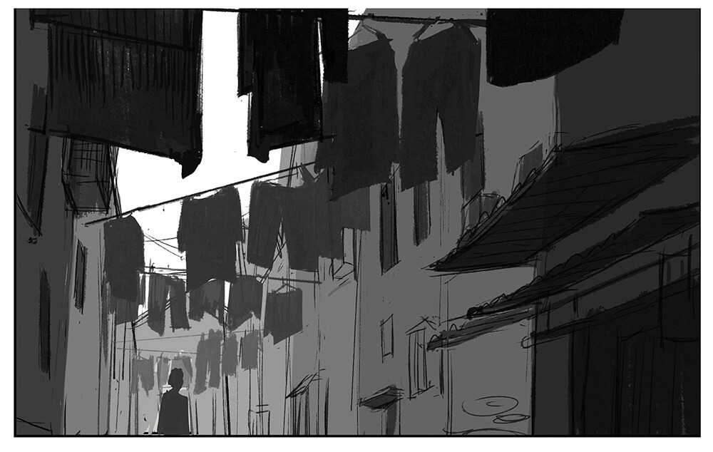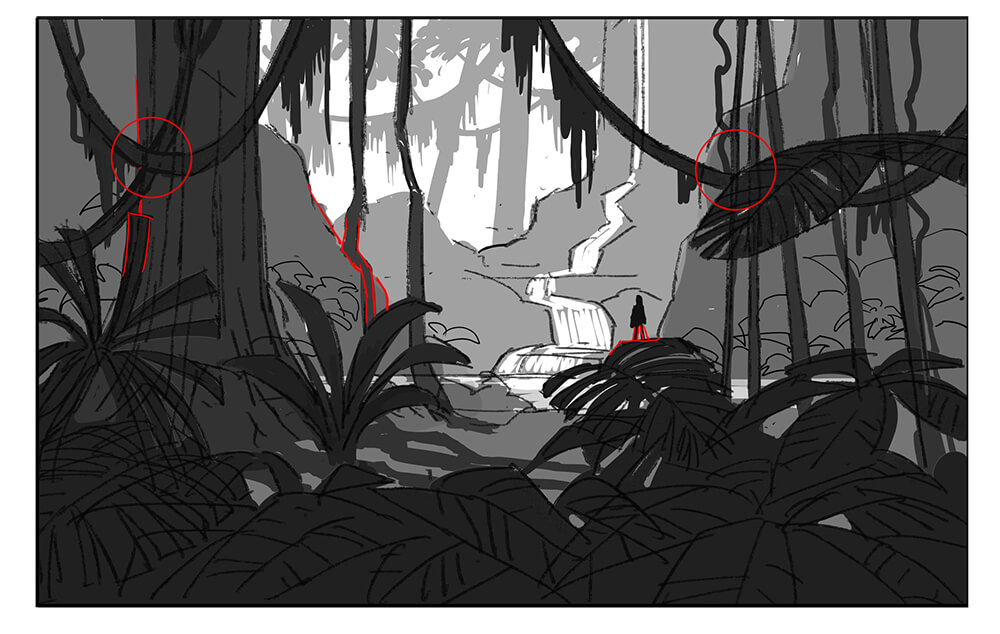 전면 레이어(Front Layer)라고도 합니다. 앞에 위치한 가장 어두운 톤 레이어입니다. 이 레이어는 그림자 안으로 들어가 화면의 프레임(프레임)이 됩니다. 다른 레이어를 돋보이게 하는 역할을 가지고 보는 사람의 시선을 초점(Focal Point)으로 유도하는 흐름을 만듭니다. 화면의 어느 부분에 초점을 맞추는지 알아보고 그리세요.