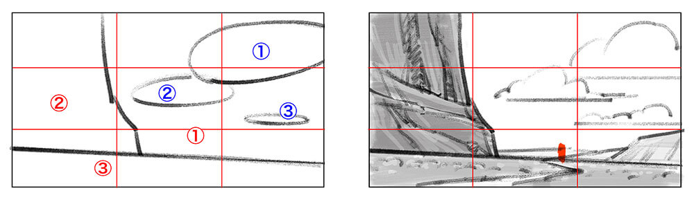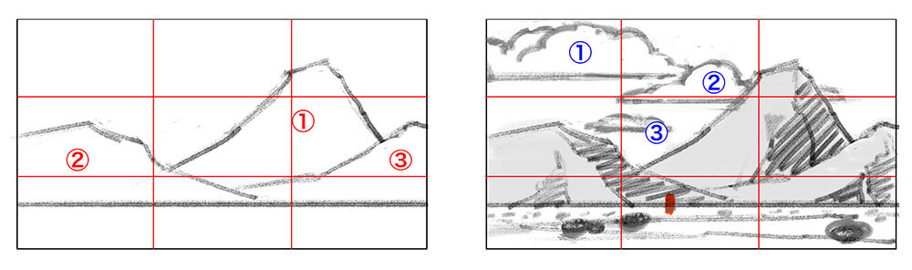 ▲화면을 적색 숫자의 3개의 덩어리로 나누어 각각에 하늘, 암벽, 지면을 그리고 있습니다. 분할에 있어서는, 3분할법도 의식하면서, 각각이 다른 형태가 되도록 주의합시다.