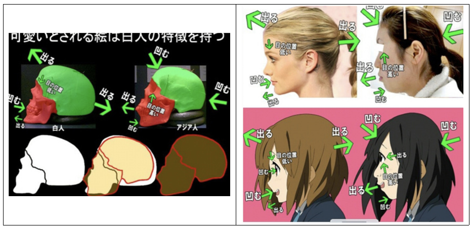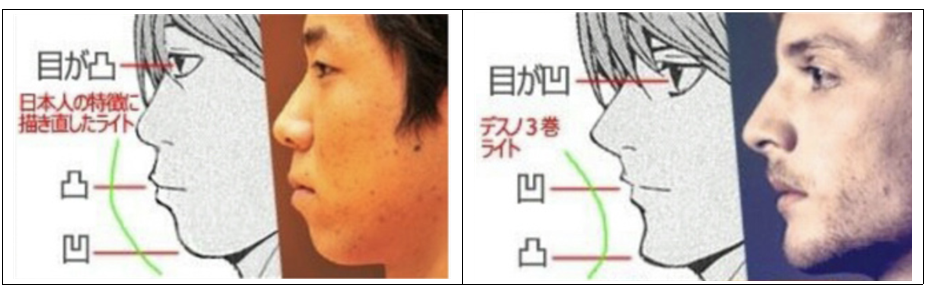 예를 들어 일본의 많은 작품에서는 [정면 = 동양인, 측면 = 서양인] 형태를 따르게 된다.