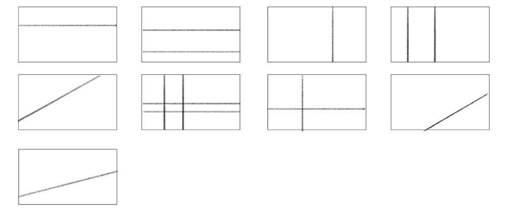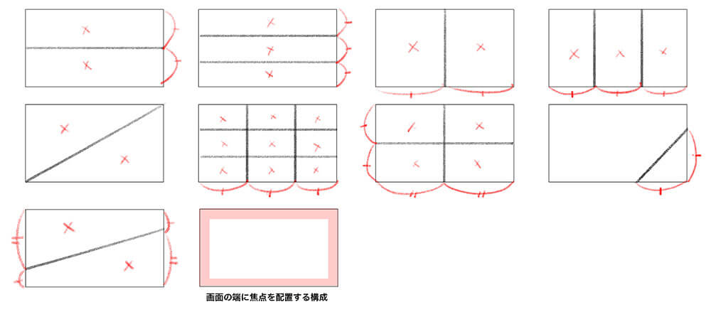 ▲다이나믹한 표현에 적합하지 않은 화면 분할의 작례. 화면을 중앙(센터)으로 분할하는 구성, 같은 분량으로 분할하는 구성, 같은 형태가 반복하는 구성, 대칭(대칭)인 구성 등이 해당됩니다. 한편, 화면의 가장자리에 초점 (Focal Point)을 배치하는 구성은 균형이 부족합니다.