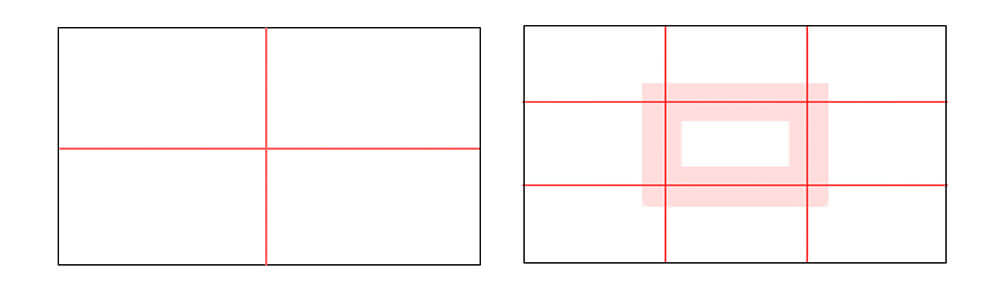 ▲【좌】화면을 종횡균등으로 2분할한 경우/【오른쪽】화면을 종횡균등으로 3분할한 경우. 얇은 적색으로 바른 위치에 큰 표지가 되는 것, 초점(Focal Point)이 되는 것, 화면을 크게 분할하는 것을 배치하면, 화면에 움직임이 생겨, 밸런스가 좋아집니다. 덧붙여 이 작례에서는, 화면의 종횡비(종횡비)를 16:9로 하고 있습니다