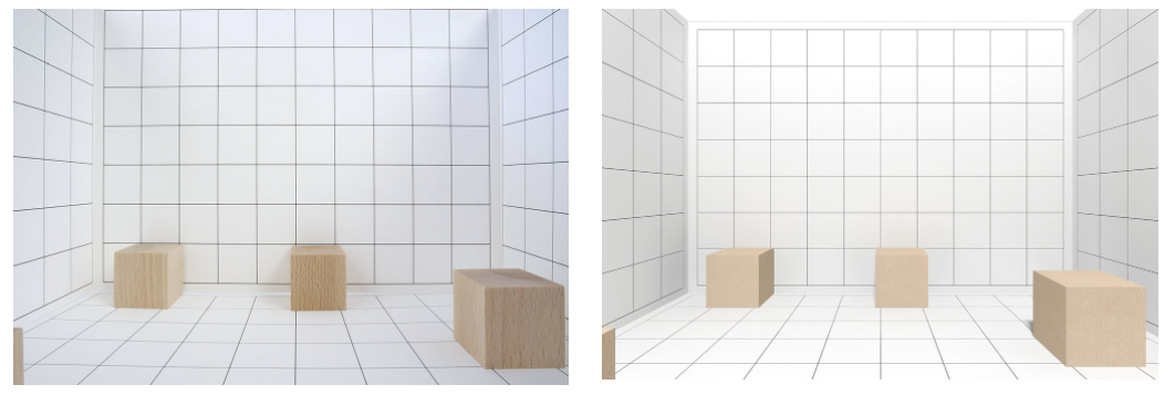 ▲ 방안지로 둘러싼 공간 내에 입방체를 배치하고, 화각 85도의 광각 렌즈로 촬영한 실사의 이미지【왼쪽】과 그것을 3ds Max의 카메라로 재현한 CG의 이미지【오른쪽】. 방안지나 입방체의 보이는 방법에 큰 차이는 없다.