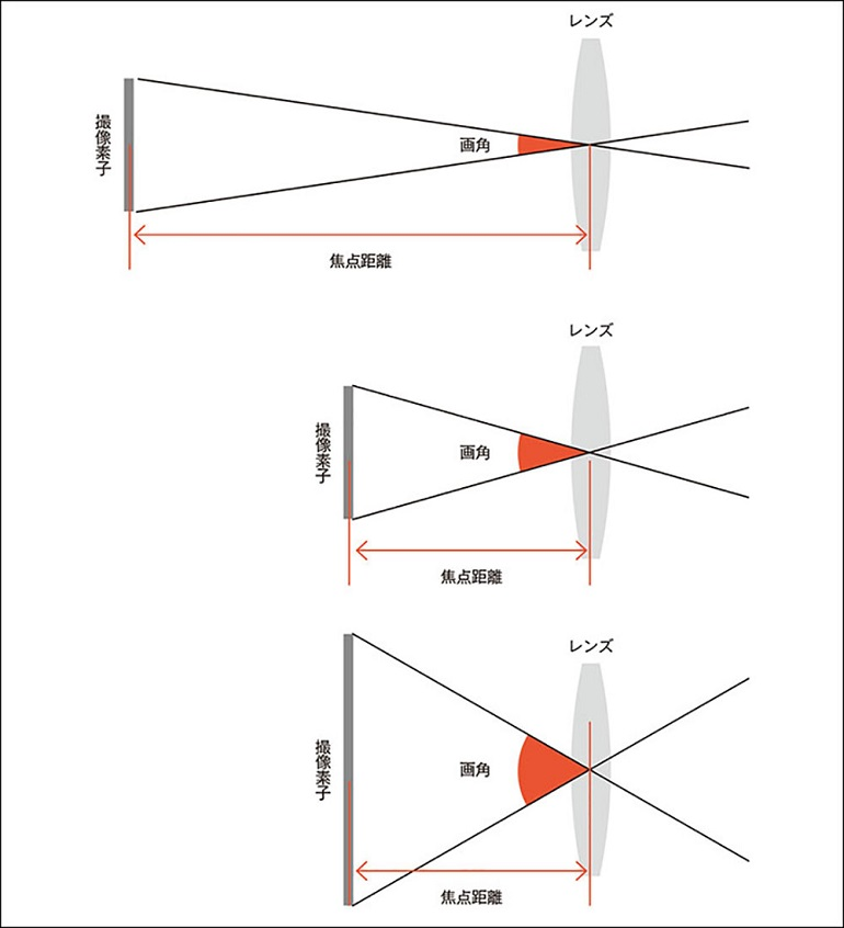 또한, 초점 거리가 같더라도, 촬상 소자의 사이즈가 변화하면 화각도 변화한다. 촬상 소자가 작을수록 화각이 좁아지고, 촬상 소자가 클수록 화각이 넓어진다.