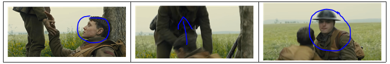 대령이 설명하고 -> 지도보여주고 -> 인물이 이동하고 -> 인물의 반응을 보여주고 -> 클로즈업해서 감정 극대화 -> 병기고 보여주고 -> 무기 받고 다시 뒤돌아서 -> 여정의 시작을 알림. |
