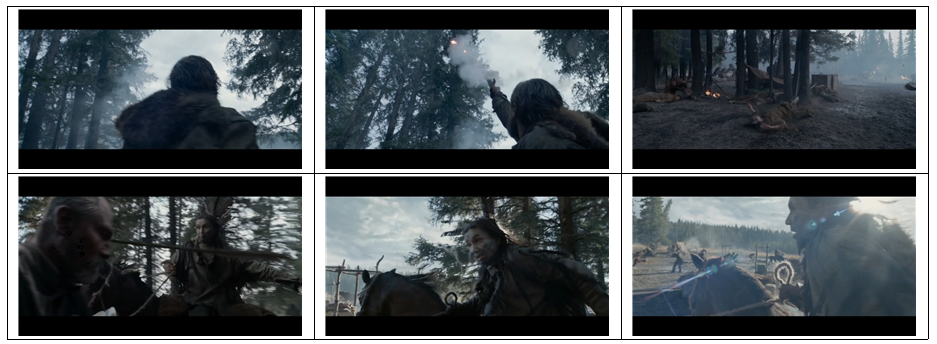 추격하는 인디언 포착 -> 처음 그것을 목격한 사람 -> 주변에 있는 동료 -> 주변을 살피다 하늘에서 날아오는 화살을 발견 -> 겁먹은 동료 발견 -> 겁먹은 동료가 뛰어나가며 사살