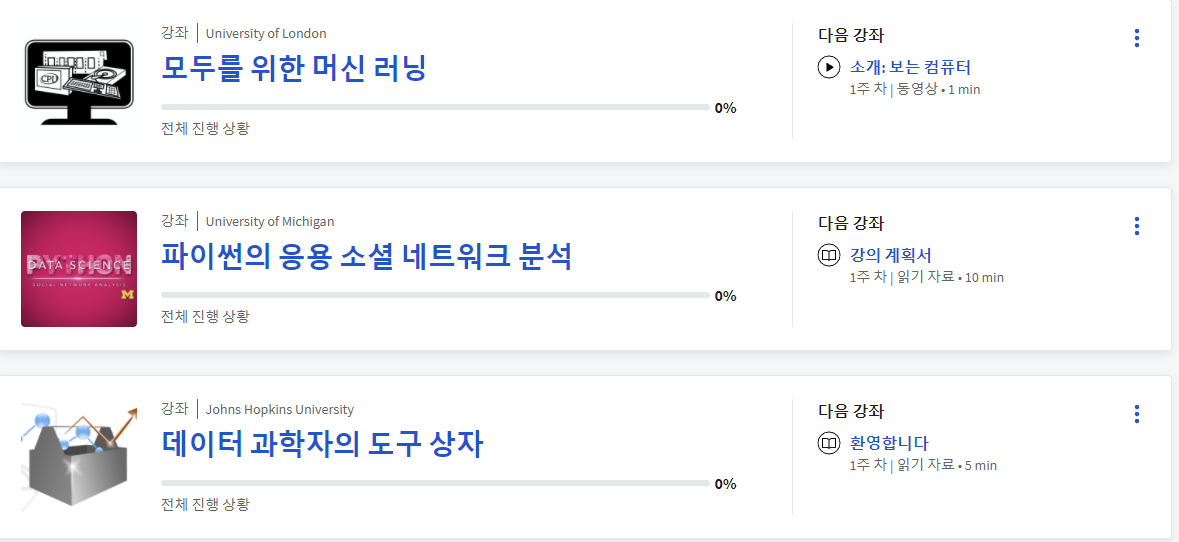 존스홉킨스와, 런던, 미시간 대학 강의를 공짜로 들을 수 있다는 게 너무 신기하고 재미있기도 하다.
