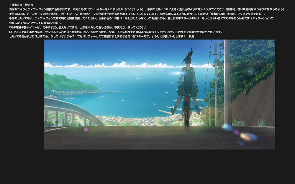 또한, 이 작품에서는 애니메이션 작업은 사전에 계획하고 결정되지만, 컴퓨터 그래픽스 (CG)와 촬영은 나중에 문제를 해결하고 세세한 조정을 하는 단계로 생각됩니다. 또한, 작품에서는 레이아웃 및 작업 감독 확인 과정에서 신카이 감독이 카메라 워크를 직접 확인하여 카메라의 흔들림이나 팬 속도와 같은 세부 사항을 신경 써서 조정되었습니다.