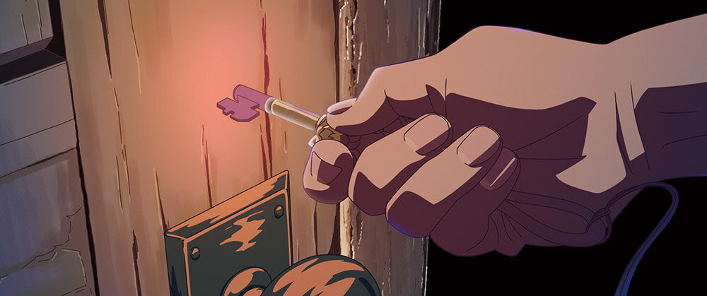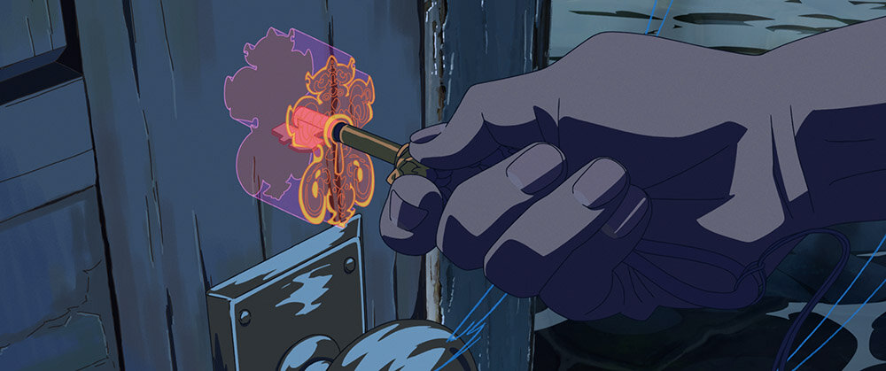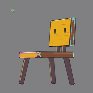 이때, 셀 애니메이션 소재와 CG 소재 간이 의자의 룩에 어색함이 없도록 하기 위해, 이런 장면에서는 전환 직전의 애니메이션 소재에 맞춰 CG 소재의 선을 끊어지게 만들고, 의자의 움직임에 맞게 변화를 줍니다.