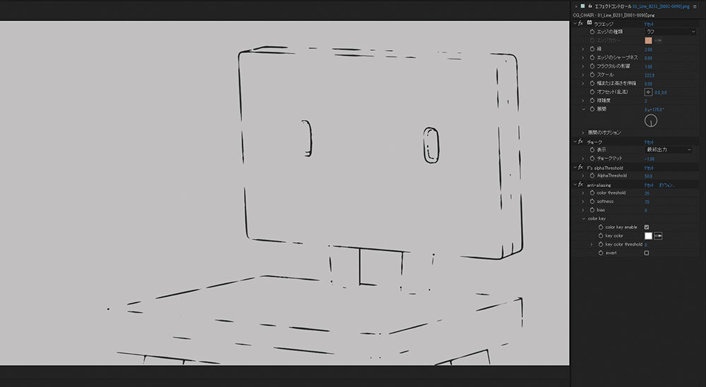 애니메이션에 맞춰 메인 라인에 거친 에지를 더하거나, 얇아 보일 경우 메인 라인을 두 번 더하여 더 굵게 만드는 처리를 적용한 장면도 있습니다.