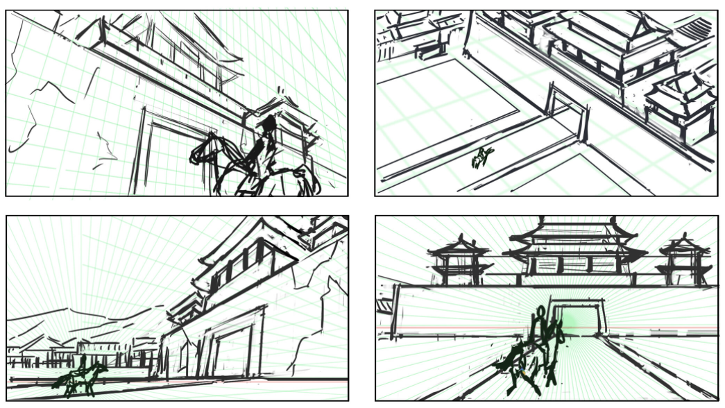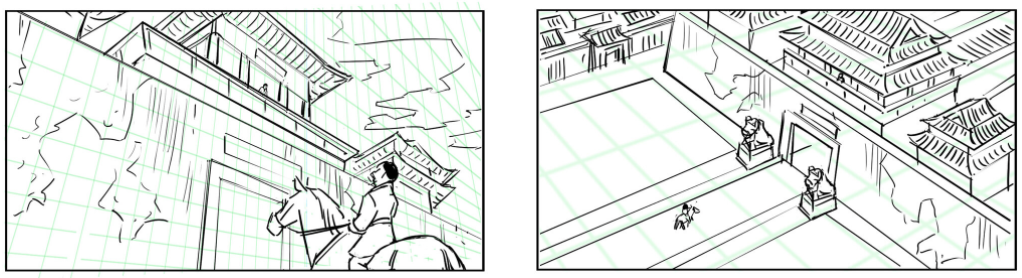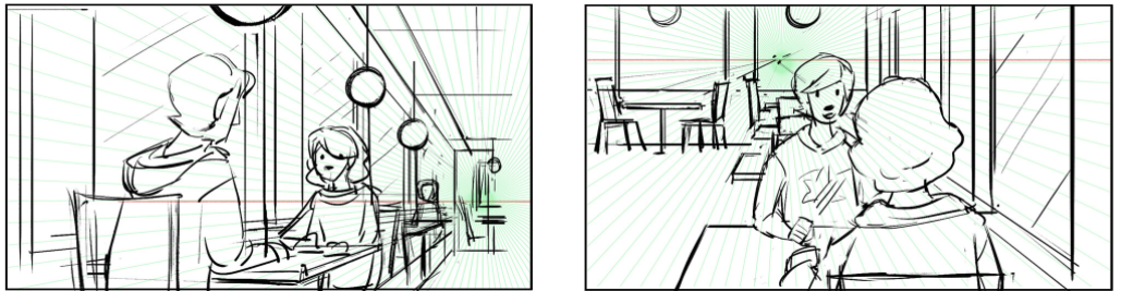 | - 스토리 전개에 따른 그림 그리기 - 3개의 투시도법을 구분하여 완전히 다른 시점(POV/Point of View)이나 앵글로 그려보세요 - 완전히 다른 화면 구성으로 그려보세요 - 그림의 초점 (Focal Point)을 명확하게 - (소실점으로 수렴하는 선)을 바탕으로, 우선은 간단한 러프를 그린다 - 여러 개의 썸네일을 그릴 수 있는데, 그 중에서 샷 스토리를 전달할 수 있는 최적의 레이아웃 디자인을 선택하세요. |