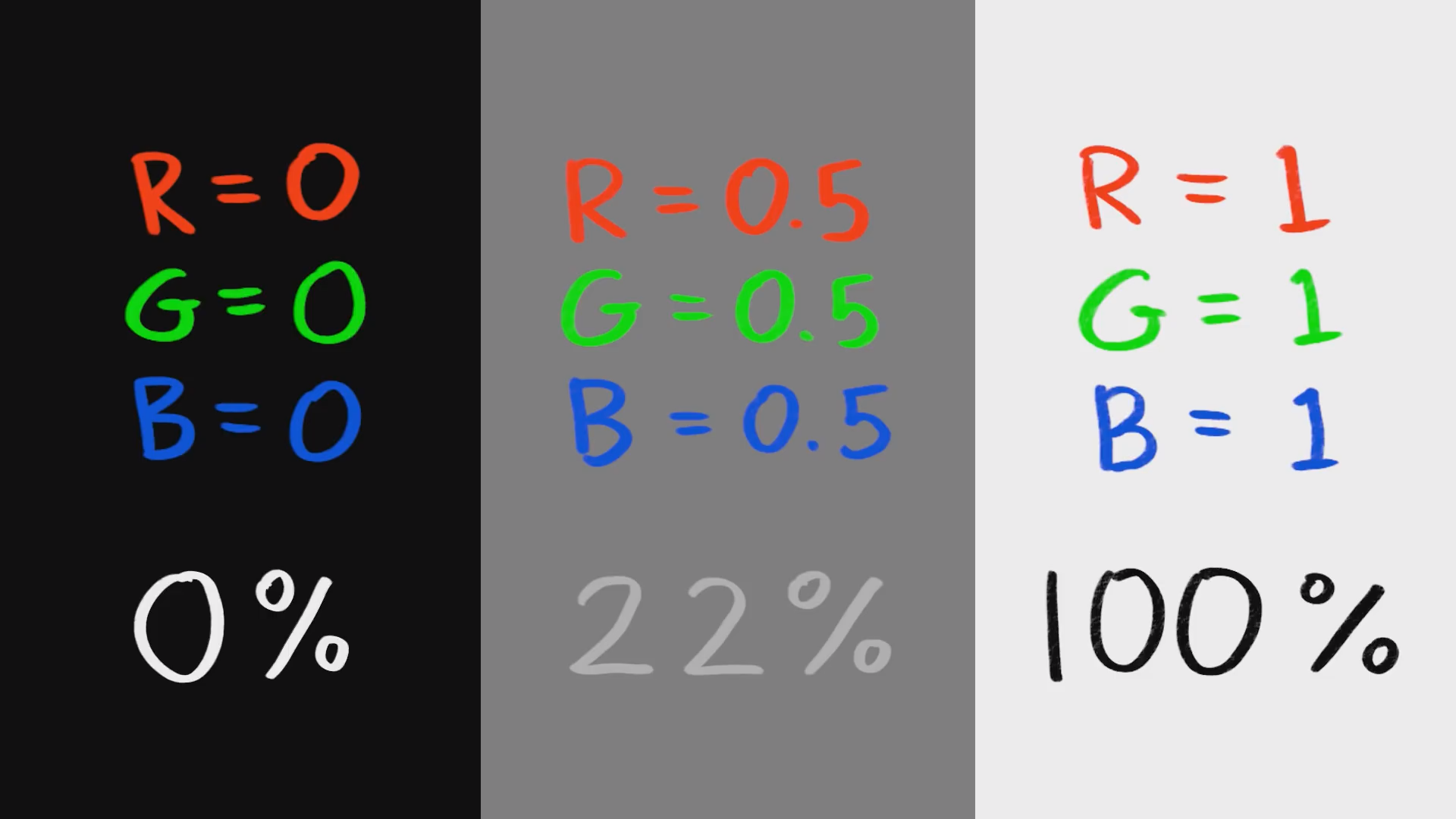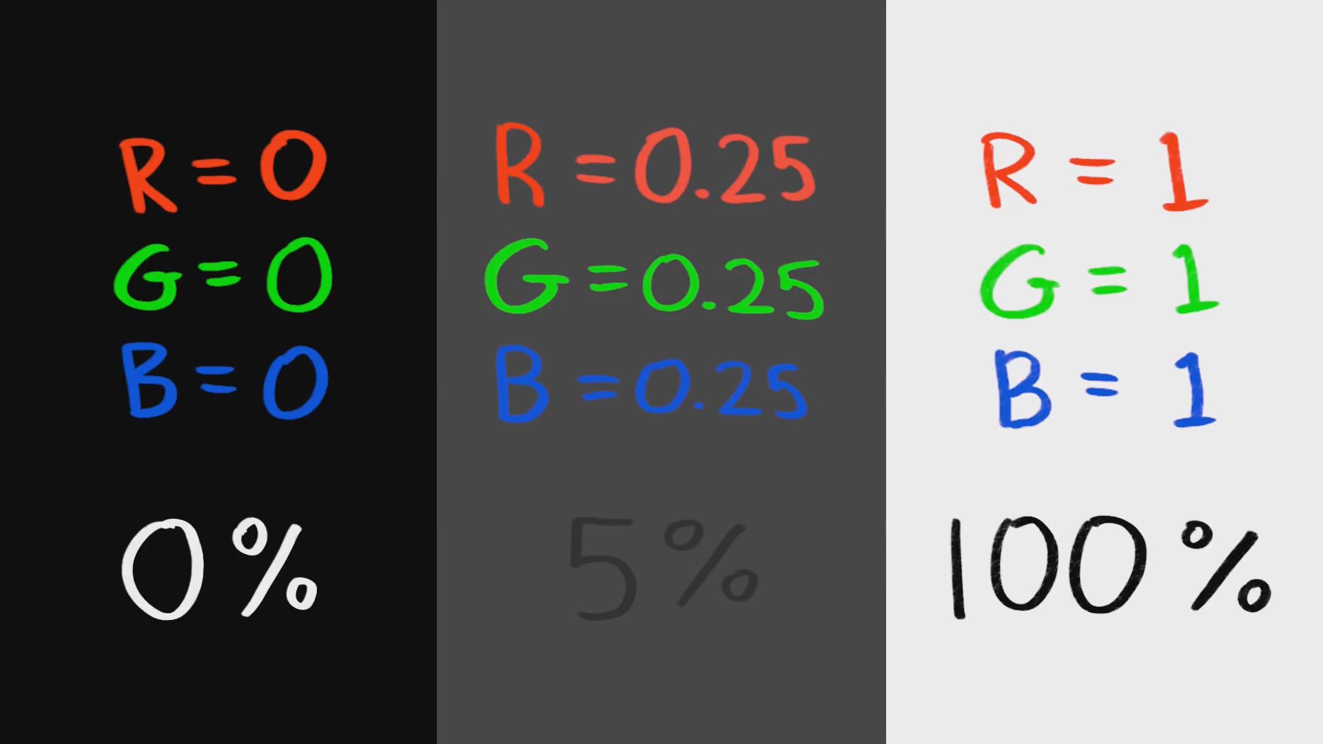* 컴퓨터는 R,G,B가 모두 0.5 수치를 중간톤으로 인식한다. 하지만, 인간은 약 1/4의 수치로 더 어둡게 표현해야 중간 톤으로 인식한다. 이런 전통적인 1/4 수치를 우리는 18%의 밝기라 말한다.