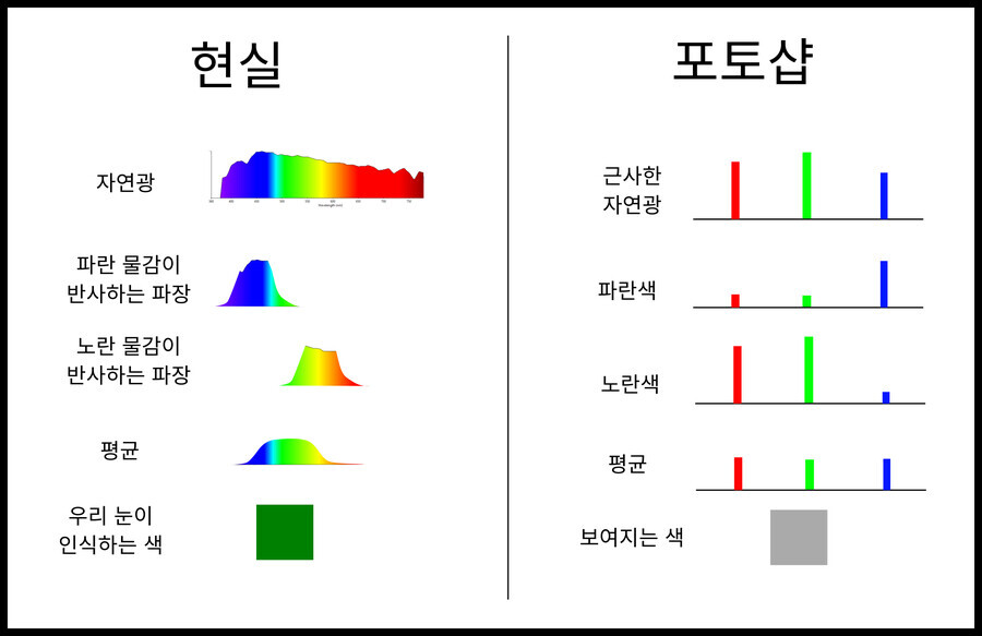 5. 따라서, 색상을 블러처리, 혹은 두 가지 이상의 색상을 혼합하였을 때 본래 의도보다 더 어두운 값이 튀어나오며, 현실의 색 혼합과 다른 결괏값을 보여주게 된다. 그래서 포토샵에는 고급 기능으로 실제 물감 혼합과 같이 색을 맞추어주는(본래 값으로 되돌린 후 평균 내어 제곱하는) 기능이 존재합니다.
