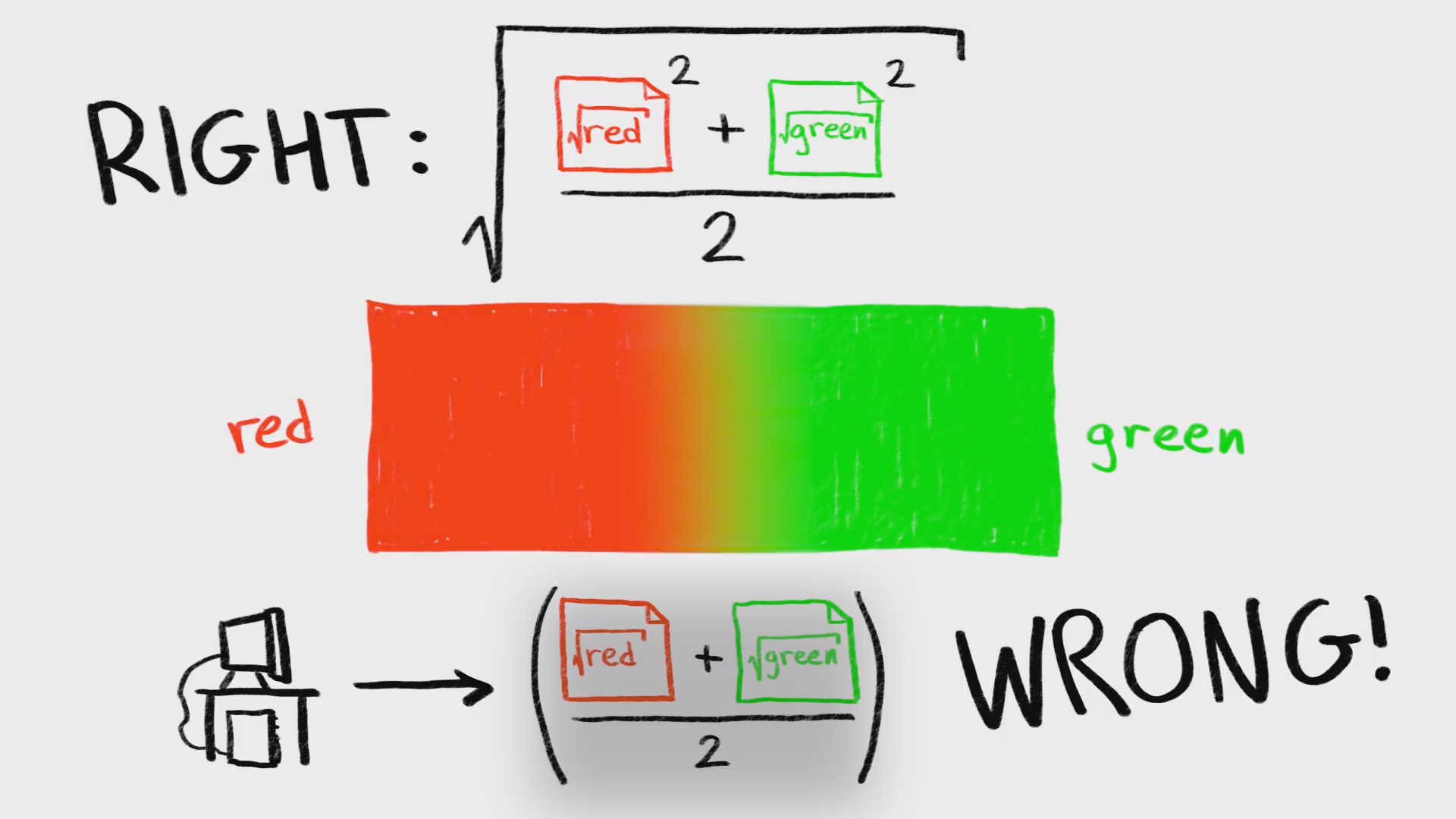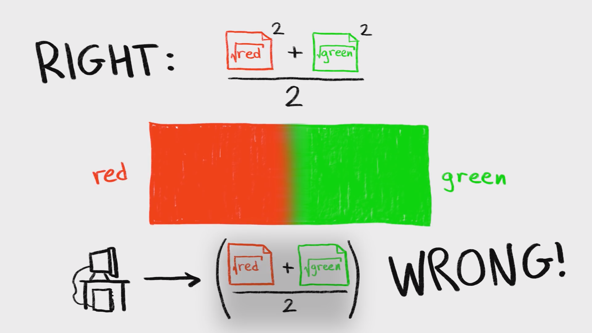 루트값을 그대로 평균내서 제곱하는 것과, 원래 값으로 되돌린 후 평균내서 제곱하여 루트값을 적용하는 것은 차이가 있기 때문이다. 인간의 눈은 곡선으로 계산하기 때문에 단순한 컴퓨터 연산의 결과와 다르다.