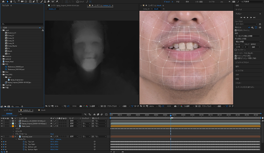 ▲ 페이셜 VFX 워크의 가이드가 되는 해석 작업. 영상 속에서의 「얼굴」을 특정하고, 그 후, 얼굴 속에서의 파트마다 해석을 실시해 간다. 이러한 분석 데이터는 페이셜 VFX 아티스트가 작업을 수행하기위한 "가이드"가됩니다.