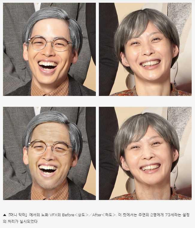 ▲「머니 닥터」에서의 노화 VFX의 Before/After. 이 컷에서는 주연에, 83세라는 설정의 처리가 실시되었다