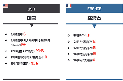 한국은 문화체육관광부 산하 특수 법인인 (영상물등급위원회)의 심의를 받아야 한다.