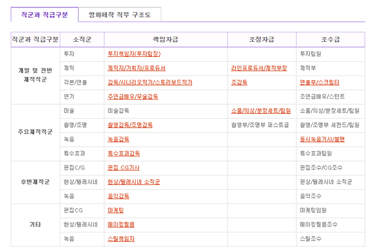 예) 스크립터 ,제작부장, 제작부장, 제작실장,PD, 조명감독, 촬영감독, 미술감독,CG실장, 특효, 무술