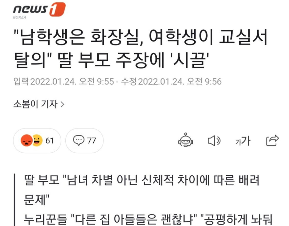 학생들이 체육복을 갈아입도록 적절한 조치를 취하지 않은 학교의 문제와 학생과의 갈등이다. 많은 사람들은 이런 사건에서 남녀 서로의 갈등만 앞세워 싸우게 된다.
