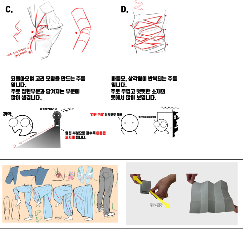 인터넷에서 「옷의 주름」등의 워드로 검색하면, 일러스트를 그릴 때 「옷의 주름」을 그리는 요령을 정리한 사이트가 다수 존재 합니다. 이 사이트를 보면 "마름모꼴"과 "미우라 접기"라는 단어가 많이 검색 됩니다.