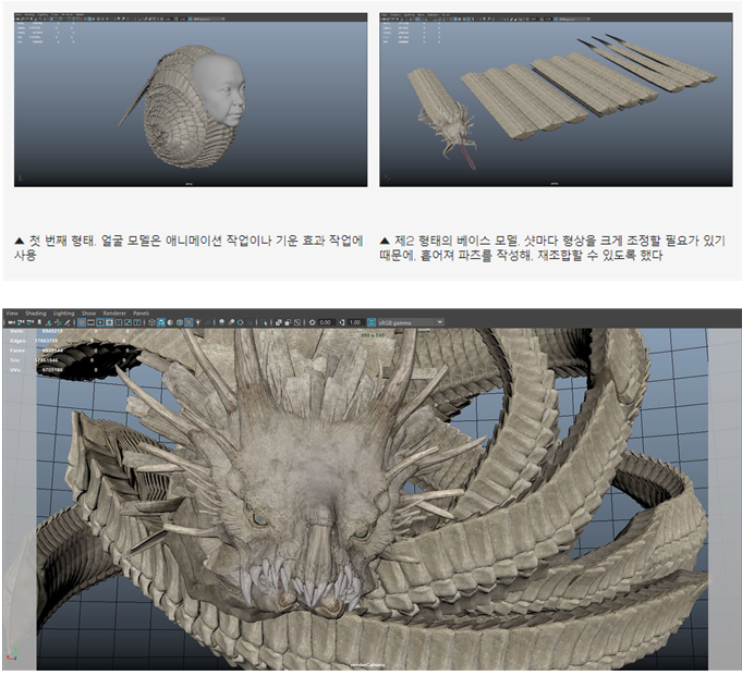 ▲ RealityCapture로 입체에 일으킨 모델(1,000만 다각형)을 주로 ZBrush 의 800여개의 모델. 털의 표현에는 XGen을 사용 ZRemesher를 사용해 파트 마다 리토폴로지했다