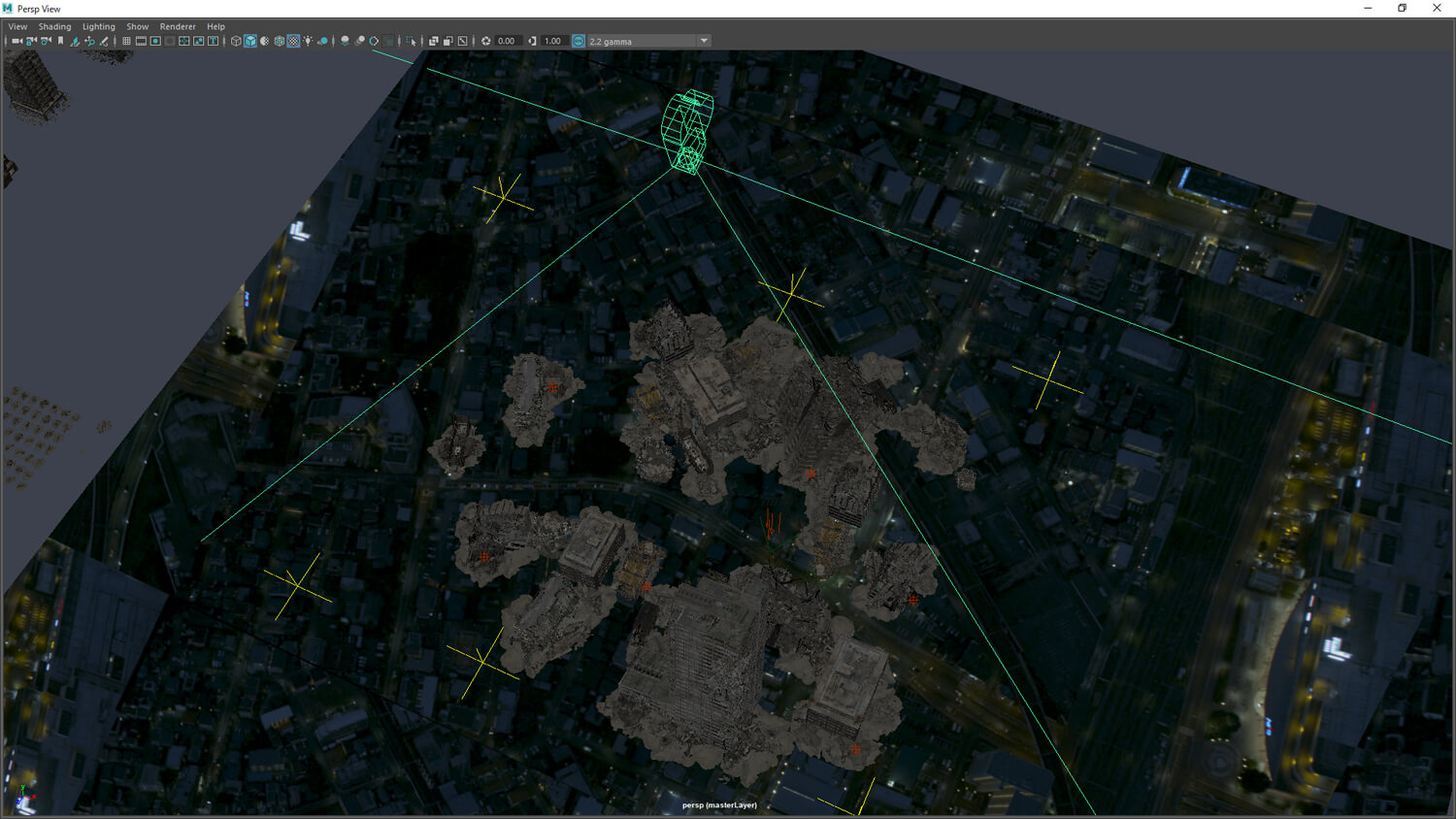 ▲드론으로 촬영한 도시의 야경에 3D로 구조물을 추가하는 방식으로 진행.