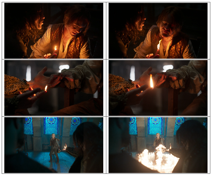 | LED를 손에 부착해, 주변광을 만들어 준다. LED의 톤을 CG로 만들려는 불꽃의 톤과 유사해야 한다. LED를 쉽게 지우기위해, 소스촬영 유무를 고민하자. |