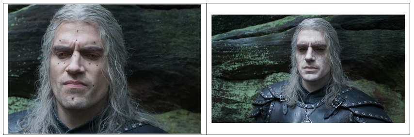 | 얼굴은 포인트 형태의 마커를 사용하는게 좋다. 마커 테이프는 떨어지거나, 너무커서 리무브 하기 힘들다. 마커는 최소로 설치해야 한다. 마스카라를 이용하면, 쉽게 마킹을 할수 있다. 배우의 얼굴에 붓으로 색칠해야 하기 때문에, 분장팀의 사전 동의가 필요한거 같다. 잘못된 마커를 사용하면, 제거가 힘들어 촬영에 문제가 될수 있다. 배우의 얼굴에 마킹을 하는 컷들은 촬영 후반부에 찍는게 좋다고 생각한다. 위쳐에선 얼굴의 핏줄을 추가하기 위해, 얼굴 형태만 트랙킹이 될 정도로 최소로 설치 된거 같다. |