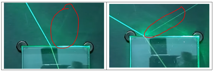 빛이 표면과 90도로 들어오면 직선이지만, 사선으로 들어오면 굴절한다.