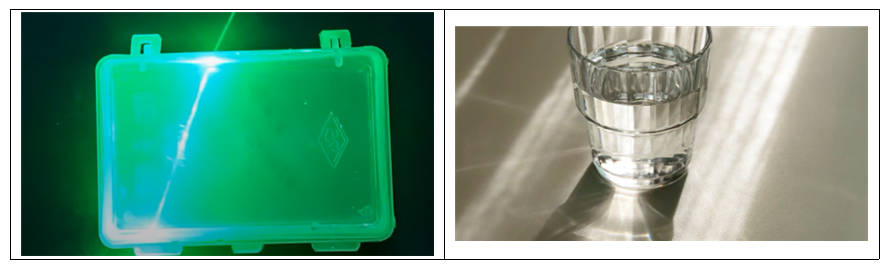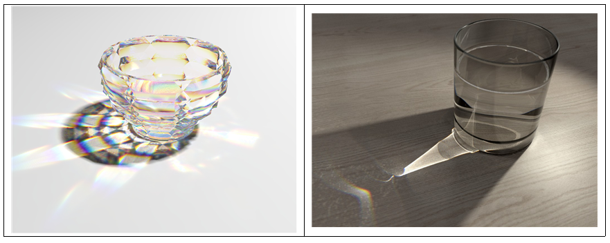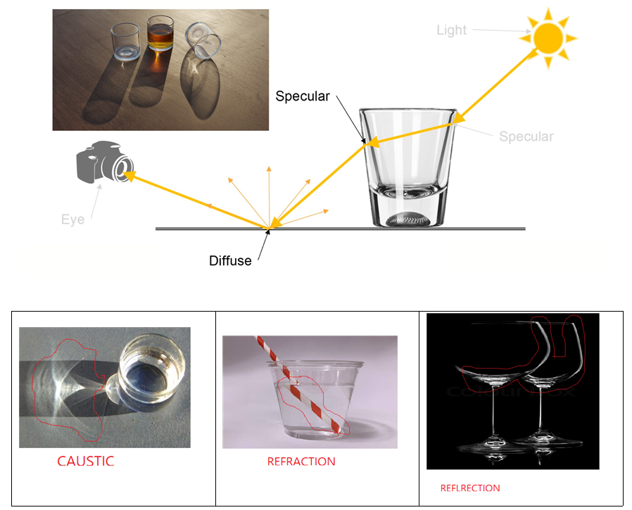 | caustic -> 빛의 모여짐, 왜곡 | refraction -> 배경 굴절 | reflection -> 스팩큘러 , 강한 반사. |
