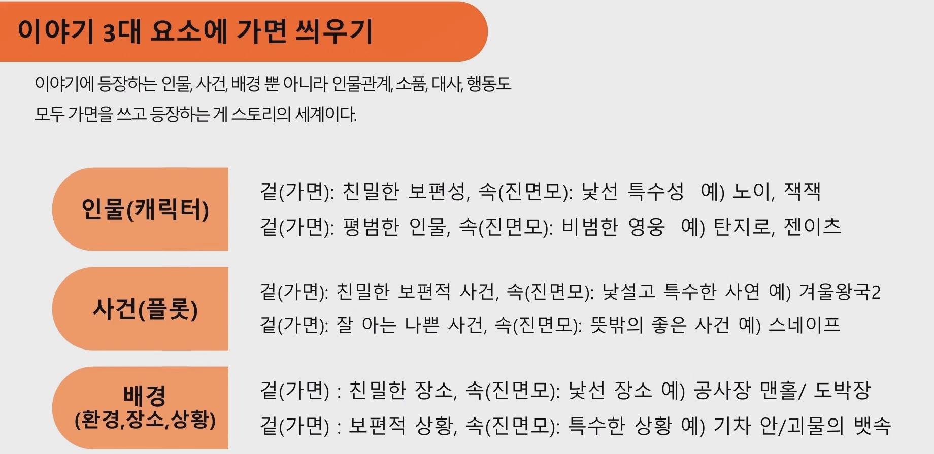 이야기의 3요소 < 캐릭터, 사건, 배경 >