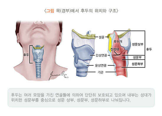 모든 포유류는 먹이를 삼킬 때에 후두 덮개라는 연골 판이 기관 입구를 닫아서 먹이가 폐로 가지 않고 위장으 로 향하도록 해야 한다. 사람은 최근에 후두가 위로 올라오면서 목구멍이 짧 아진 탓에, 음식물 삼키킬 공간이 빡빡해졌다.