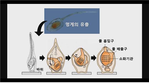 멍게는 태어나서 바닷속을 유유히 떠다니며 특정한 장소에 안착하게 된다.