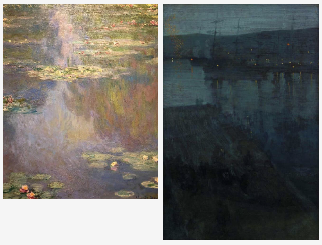▲【왼쪽】클로드 모네(Claud Monet/1840~1926)의 수련 그림으로 하이키로 표현되어 있습니다/【오른쪽】제임스 애봇 맥닐 휘슬러(James Abbott McNeill Whistler/1834~1903)의 항구 그림에서 로키로 표현.
