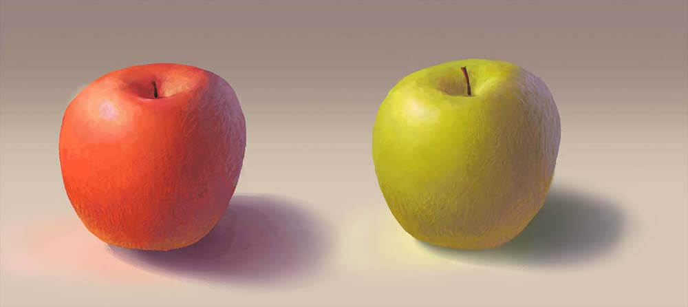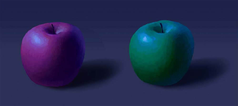 ▲ 빨간색과 파란색 사과를 로우 키로 페인트하고 있습니다. 여기에서는 약한 달빛이 맞는 설정으로 했습니다. 같은 사과에서도 라이팅이나 가치의 영역이 바뀌면 그림의 분위기와 색도 상당히 바뀝니다.