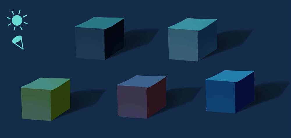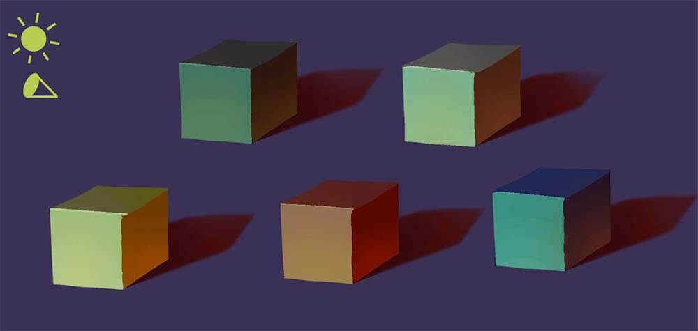 인공광을 사용하는 경우라도, 흑·백의 박스를 페인트했을 때와 같은 원리를 사용해, 밸류를 컨트롤 합니다. 상자에 어떤 색상을 적용하더라도 빛과 음영 규칙은 항상 변하지 않습니다. 다만 자연광과 다르고, 인공광에는 다양한 색을 설정할 수 있기 때문에, 빛의 색에 따라서 로컬 칼라(모티프의 본래의 색)가 바뀝니다. 빛이 닿는 부분뿐만 아니라 전체 색상도 영향을 받아 바뀌므로 색상이 흐려지지 않도록 주의합시다.